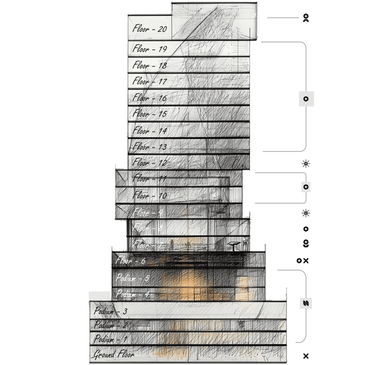 The building spans G+20 floors, with each level designed for privacy, performance, and presence.