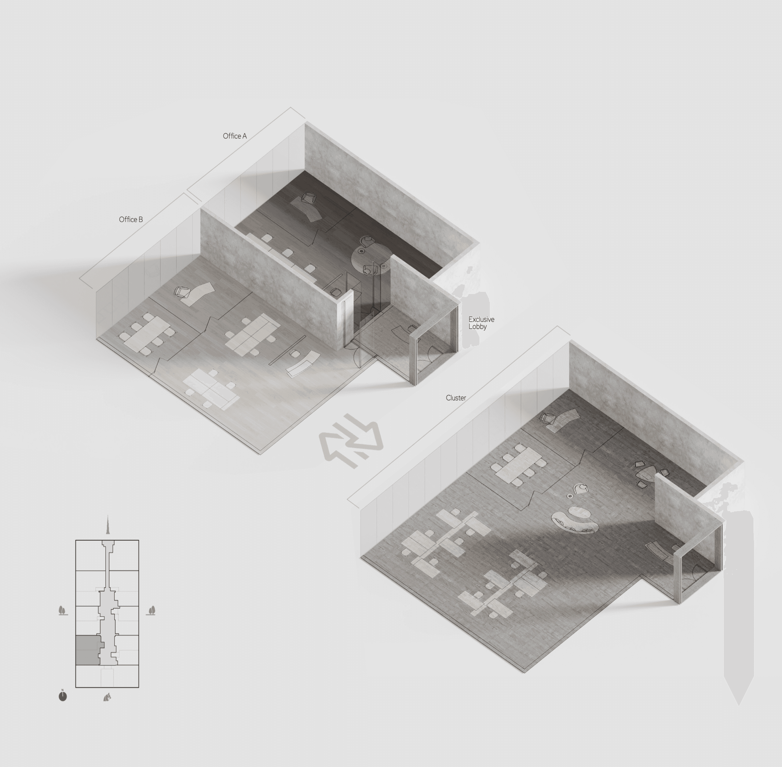 Each office remains independently owned, yet clusters can be combined to form larger, more fluid environments that evolve with the needs of their occupants.